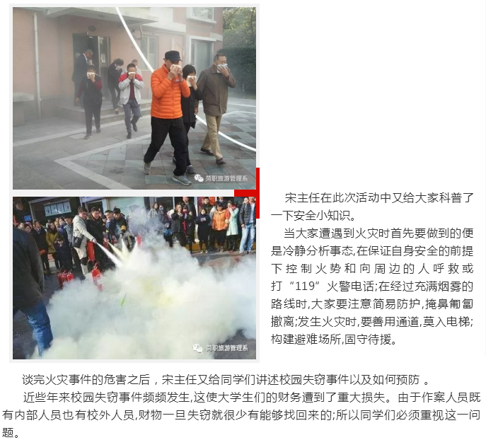 我系为响应学院号召于三月二十日下午各班利用班会时间观看《齐鲁消防》节选 ,对学生进行安全教育。宋主任及各班班主任针对加强学生安全教育问题进行开会研究。 此次的安全教育讲座,在宋主任的带领下让同学们知道了作为大学生该如何正确的防范这些事故的发生,减少不必要的损失;这是大学生共同的责任和义务。